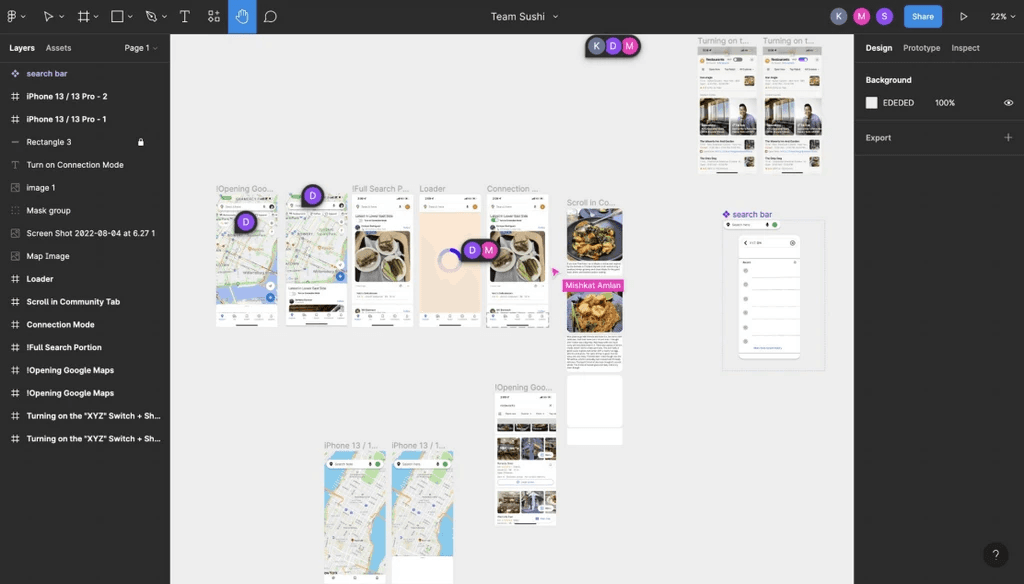 With a short project timeline, we starting building our design in Figma. Our team collaborated in a shared design file, combining sketches and concepts into cohesive screens while continuously refining them to align with Google Mapsโ design system and visual language.