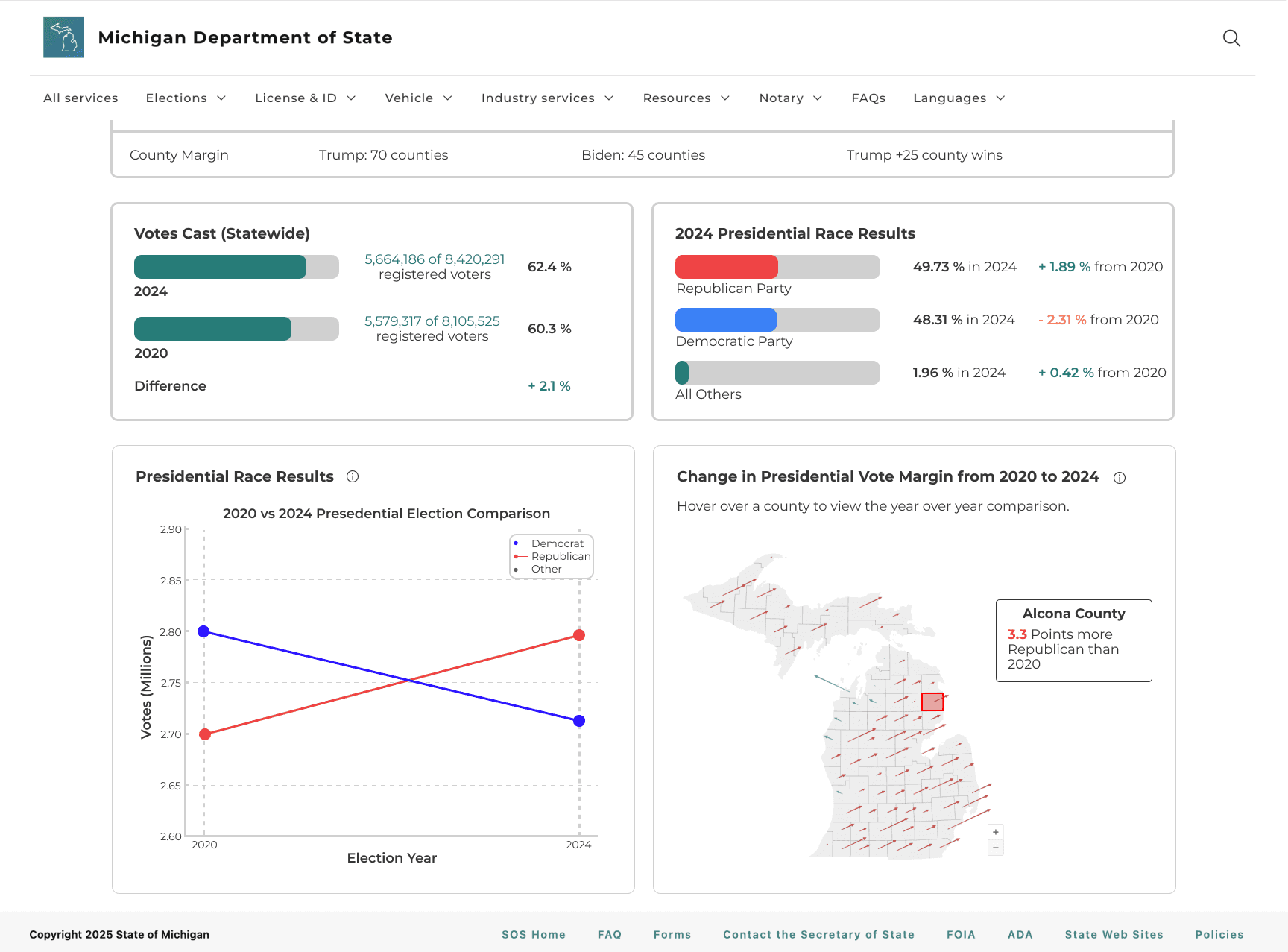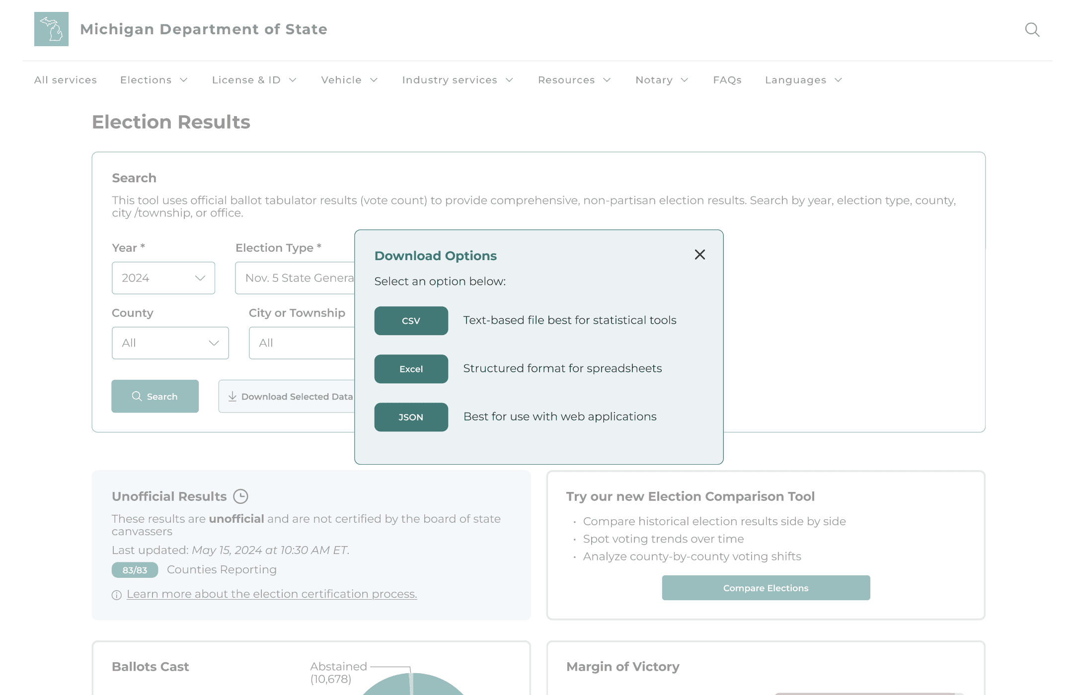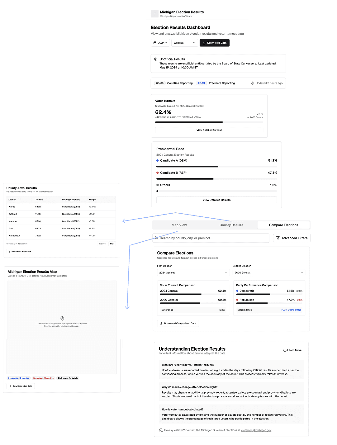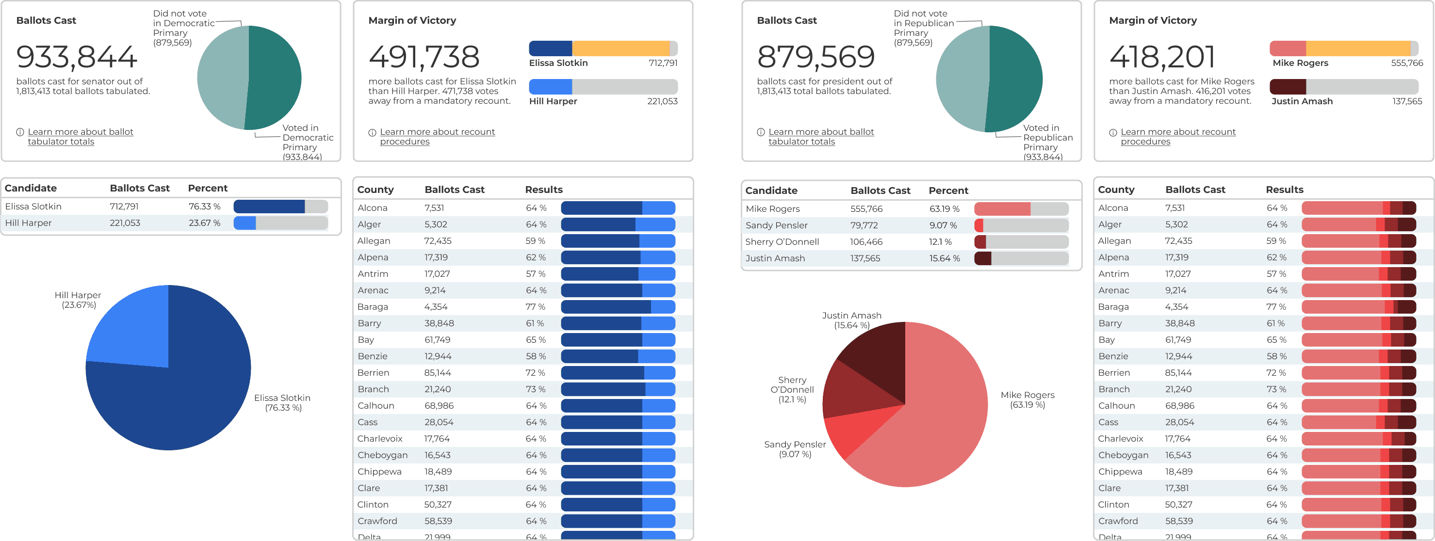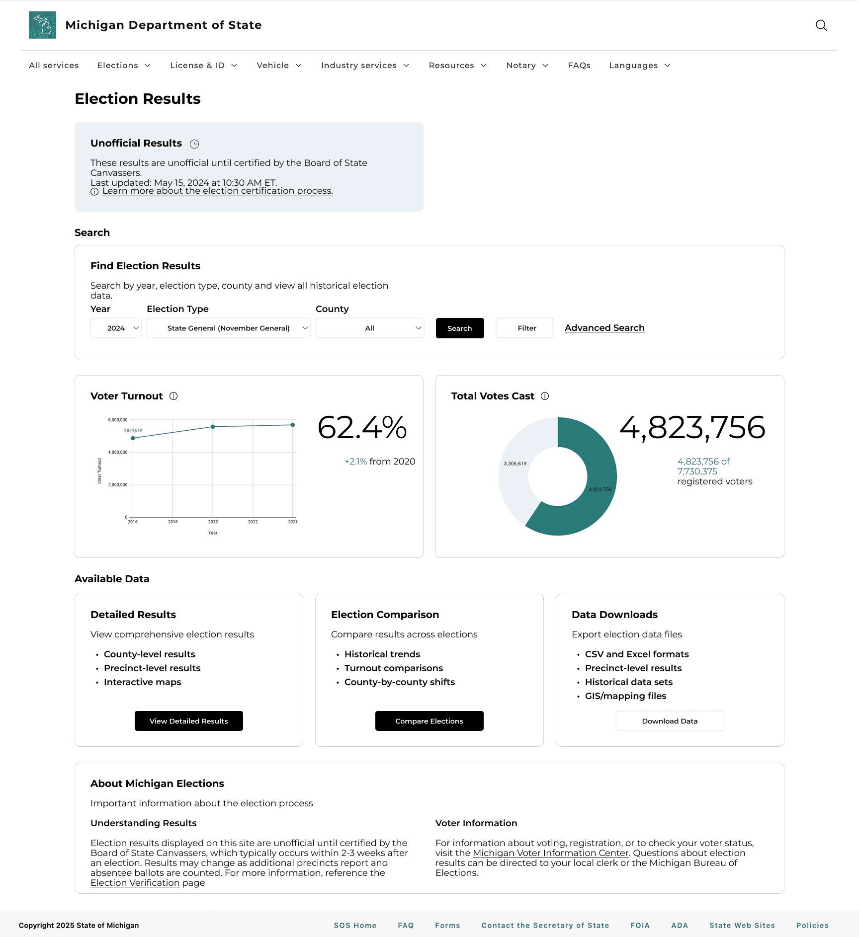 The Michigan Department of State launched its first public elections dashboard in Nov 2024, with additional versions on the way. Our team partnered with Michigan Department of State to re-imagine how election results are communicated. The client's goals were to understand stakeholder needs and define clear, user-centered approaches for visualizing election data in a trustworthy, accessible, and interactive way.