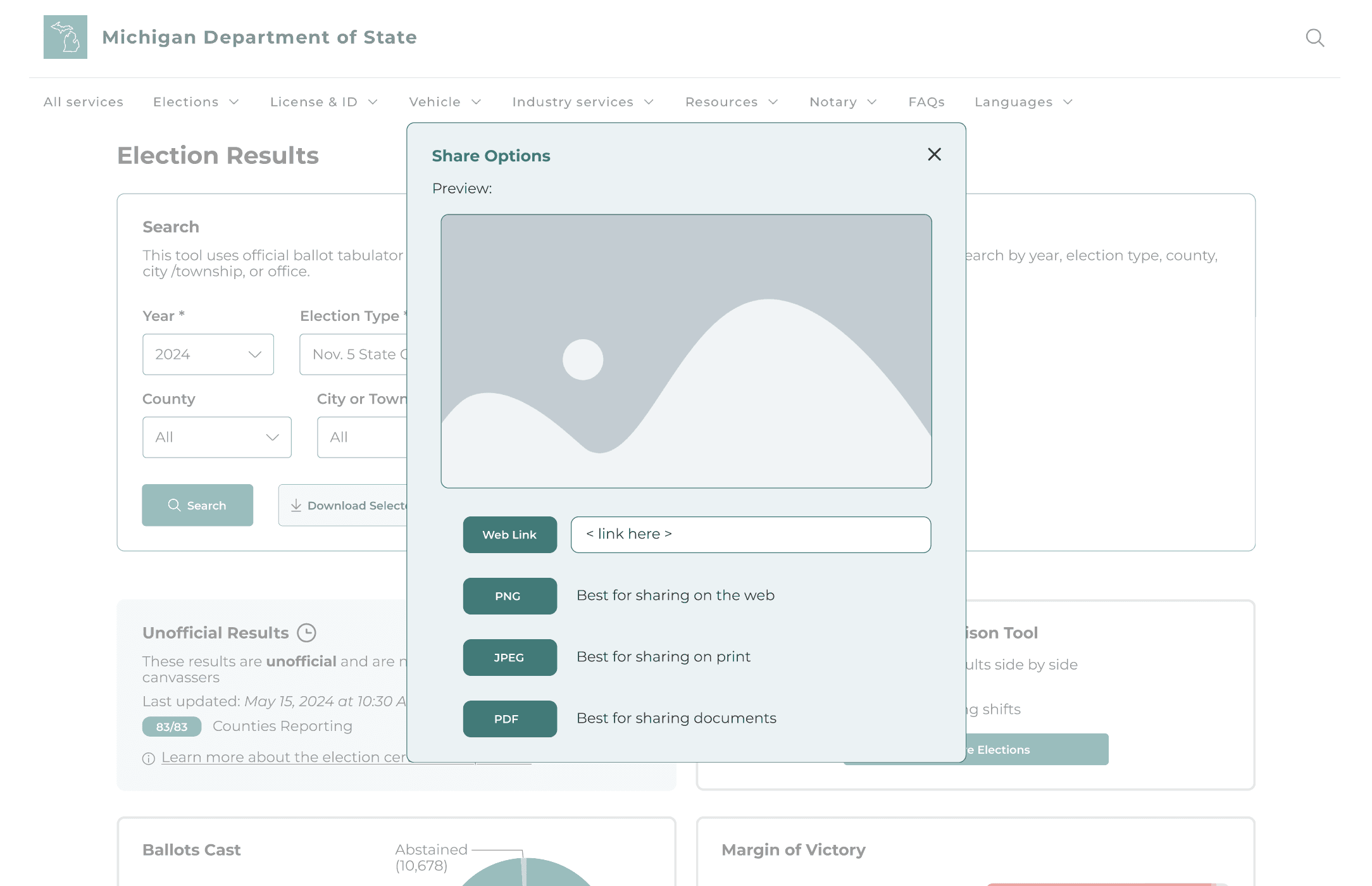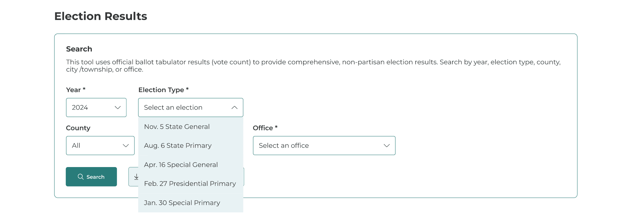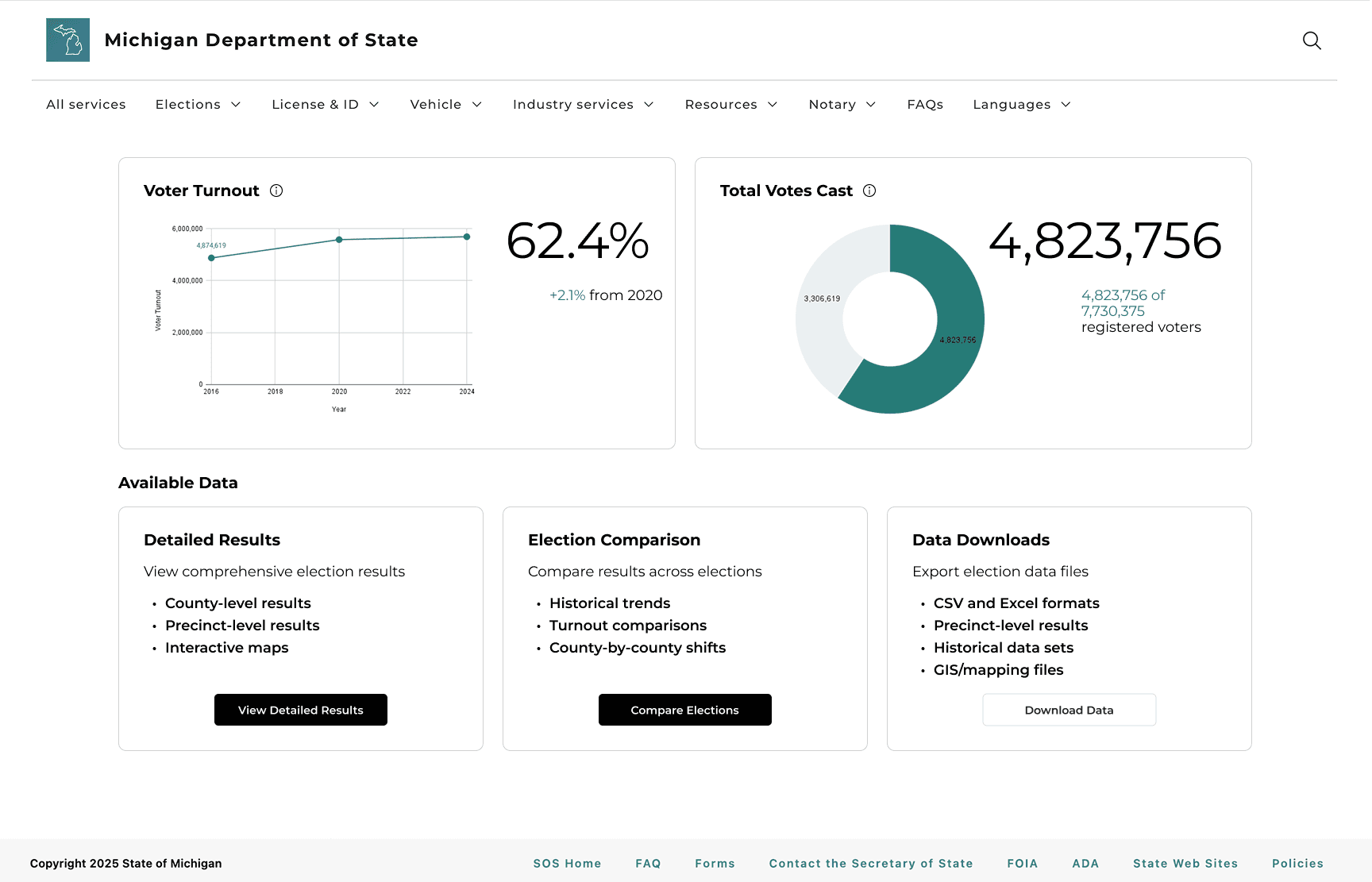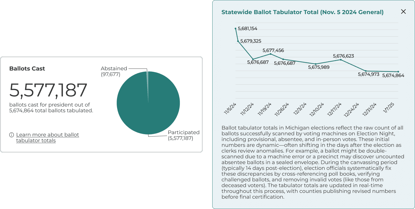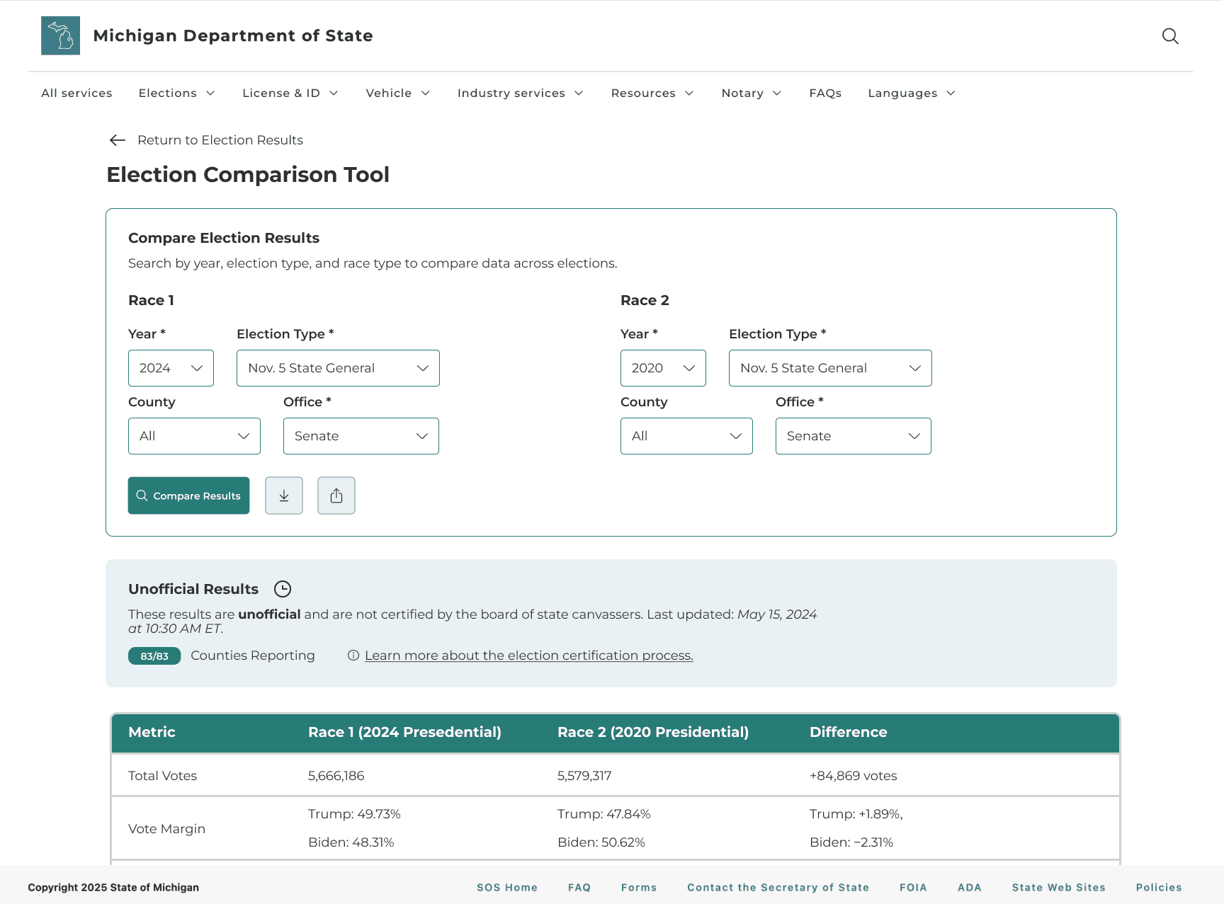 The Michigan Department of State launched its first public elections dashboard in Nov 2024, with additional versions on the way. Our team partnered with Michigan Department of State to re-imagine how election results are communicated. The client's goals were to understand stakeholder needs and define clear, user-centered approaches for visualizing election data in a trustworthy, accessible, and interactive way.