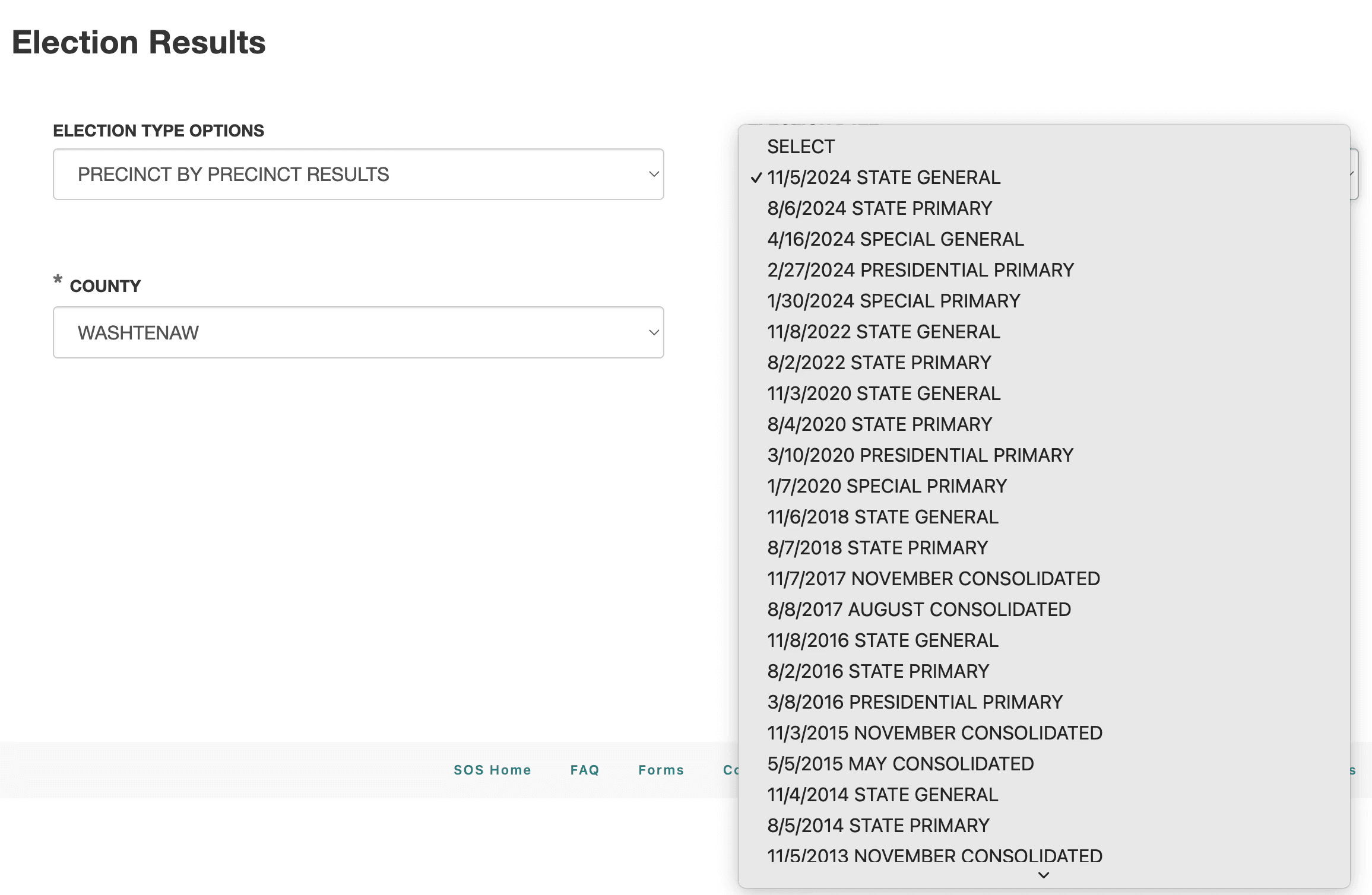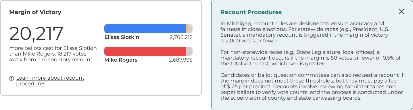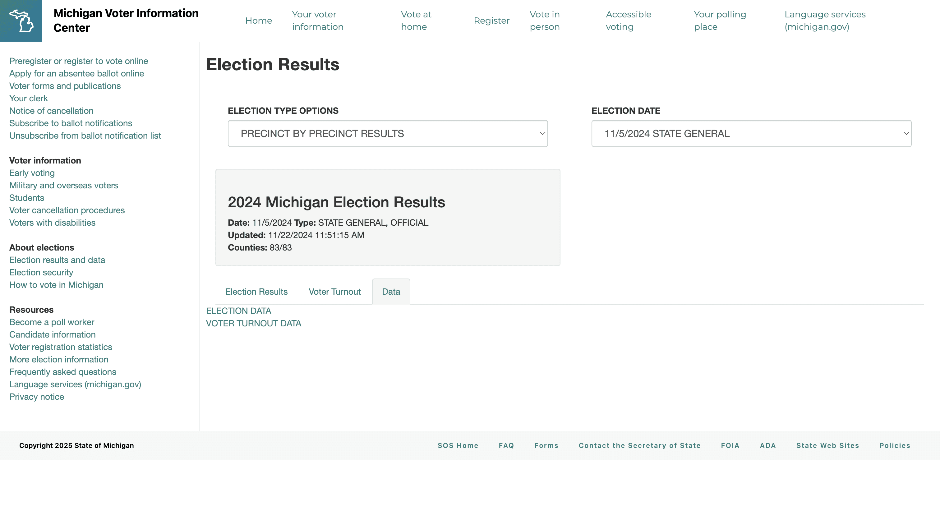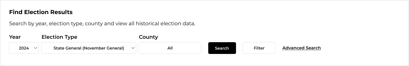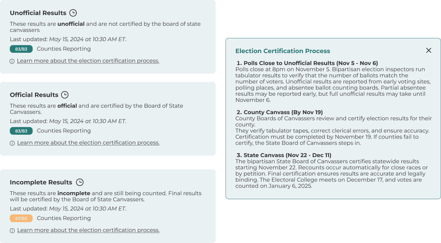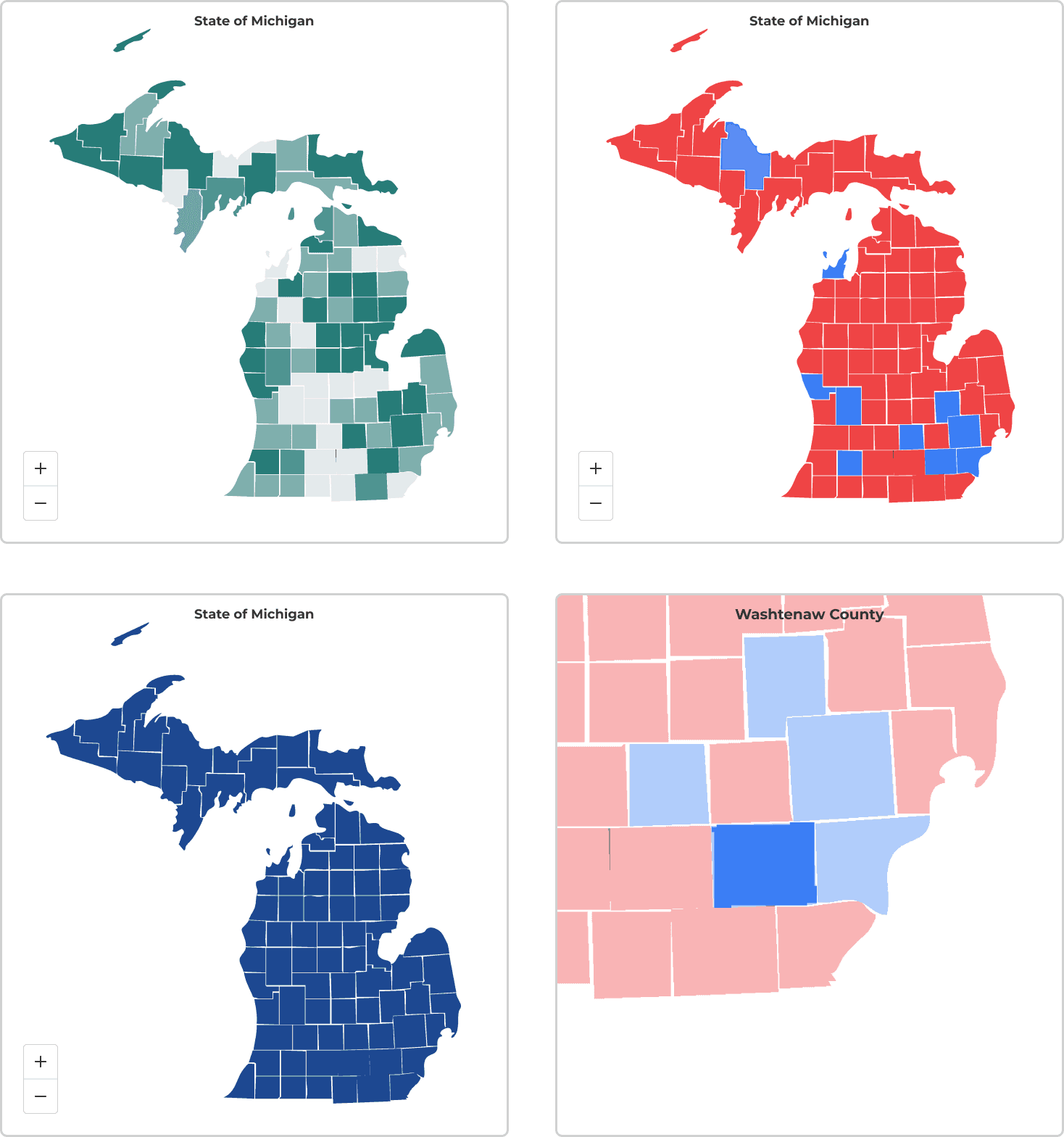 The Michigan Department of State launched its first public elections dashboard in Nov 2024, with additional versions on the way. Our team partnered with Michigan Department of State to re-imagine how election results are communicated. The client's goals were to understand stakeholder needs and define clear, user-centered approaches for visualizing election data in a trustworthy, accessible, and interactive way.