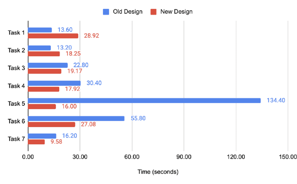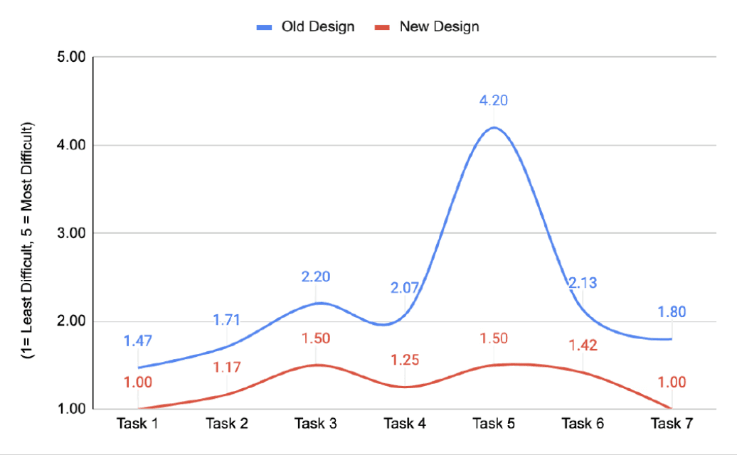 Users found the new interface easier and faster overall. Perceived difficulty dropped across most tasks, most notably on Task 5 (โ64%), and average task times fell (โ52%).