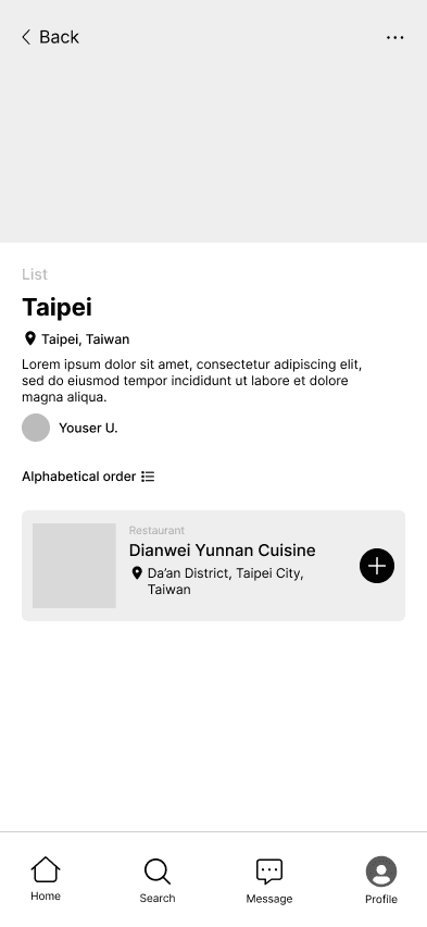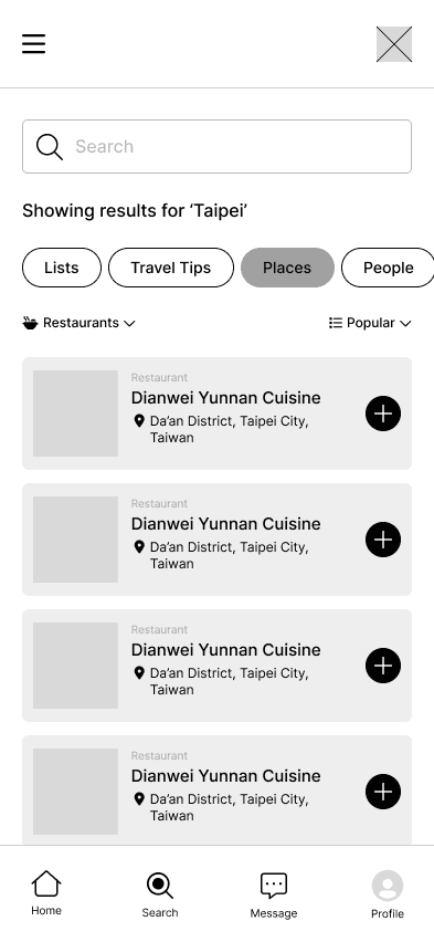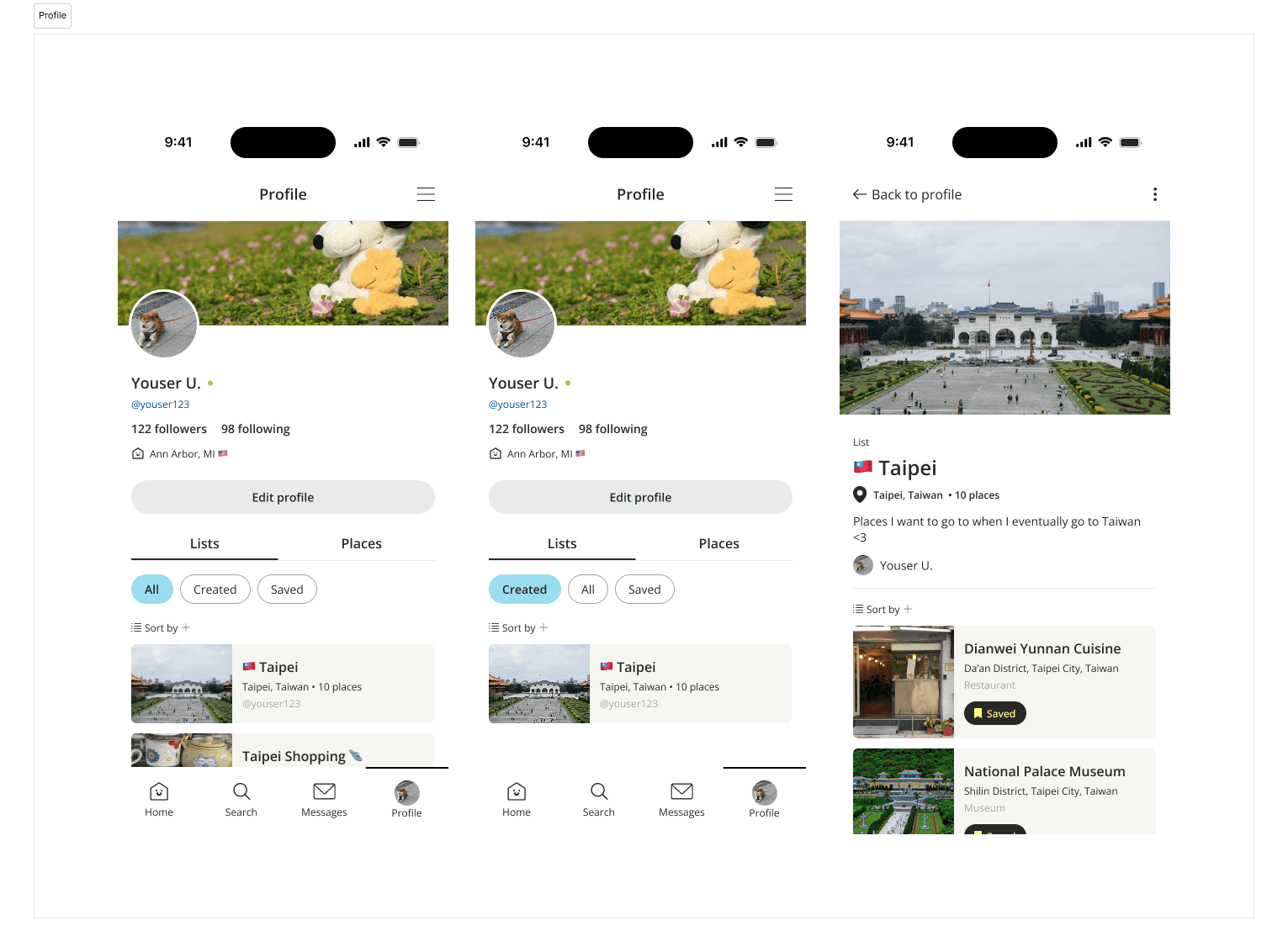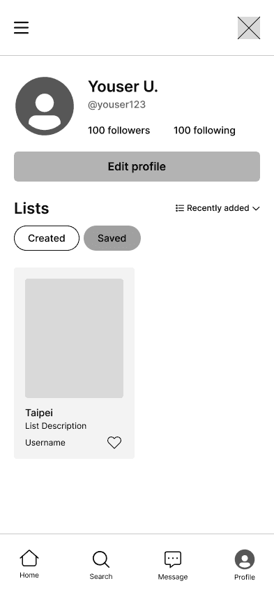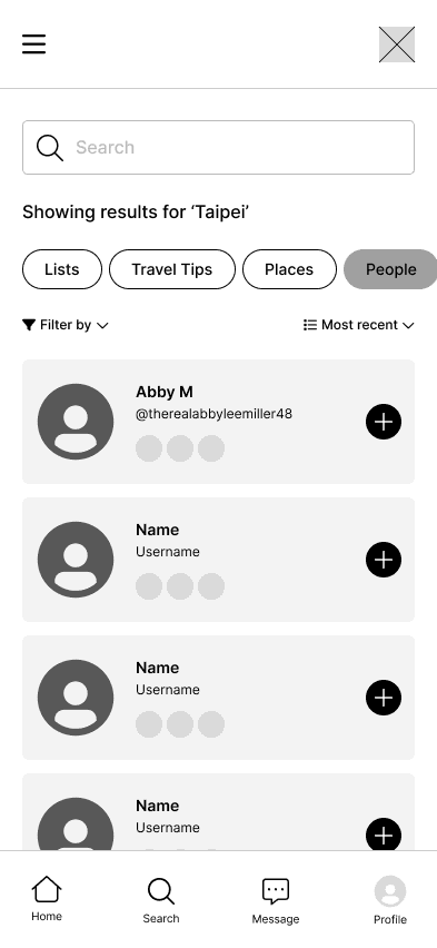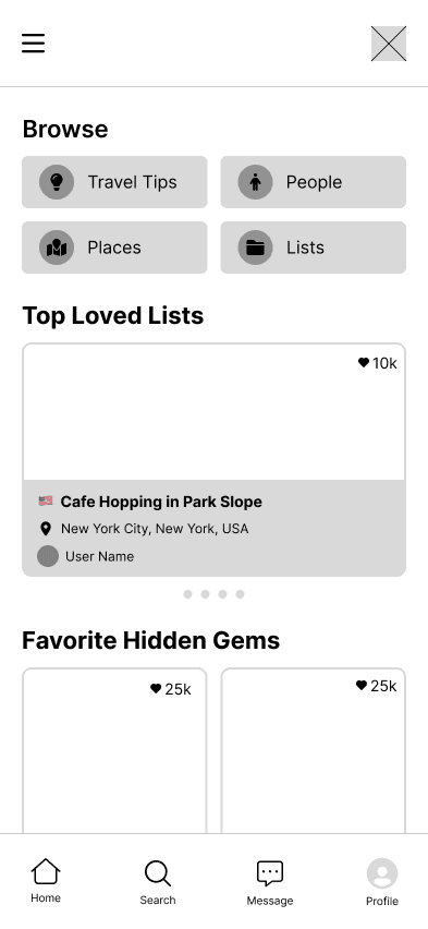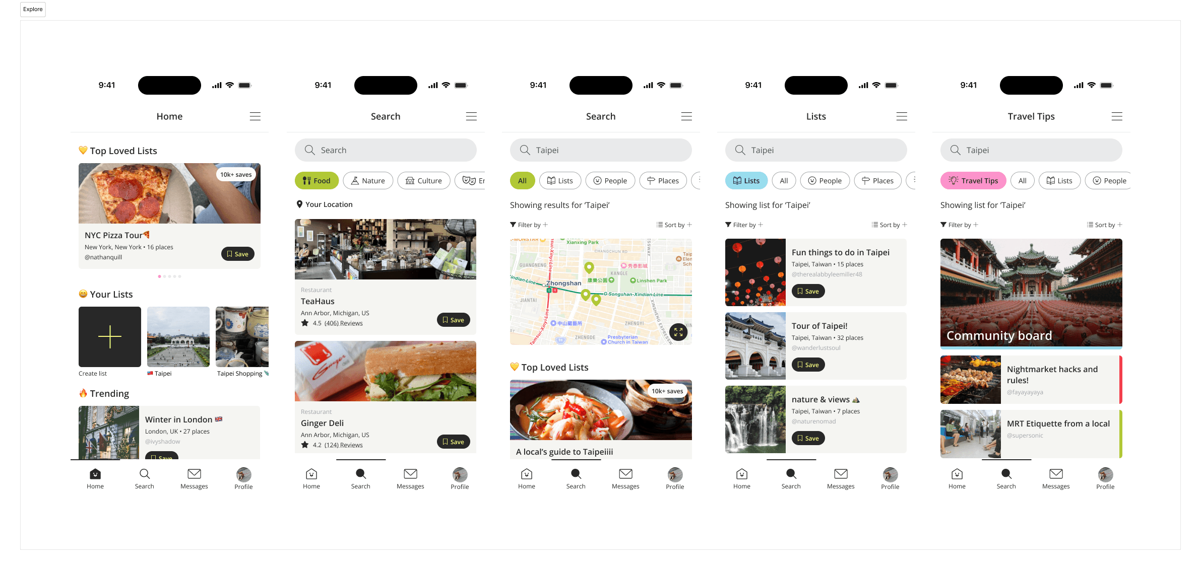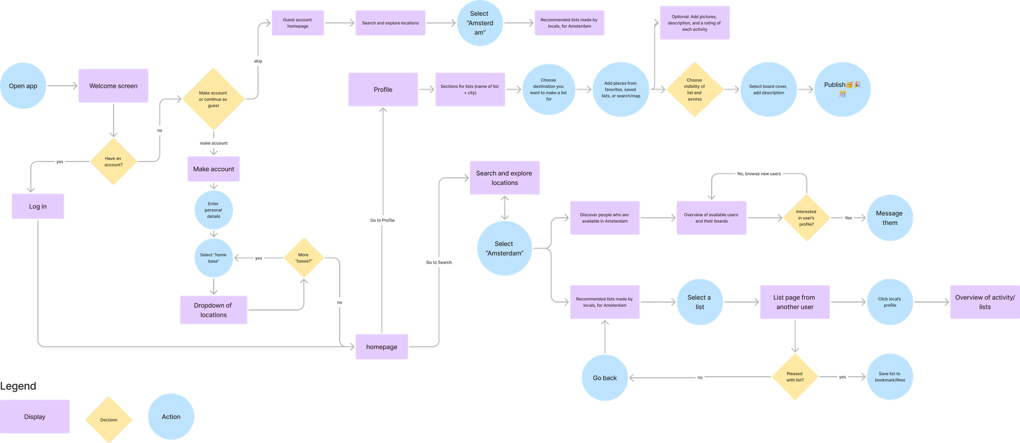 With the core features we identified through dot-voting and user research in mind, we envisioned how a user would navigate through our app. We designed an onboarding flow that personalizes the app to the user's location, clear paths for creating and managing lists in a userโs profile, exploration flows for searching cities and browsing curated lists, and social flows for viewing profiles and messaging other users.