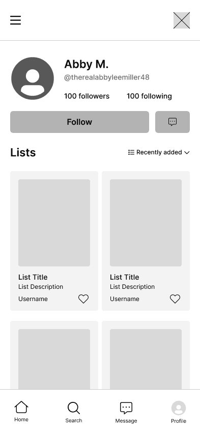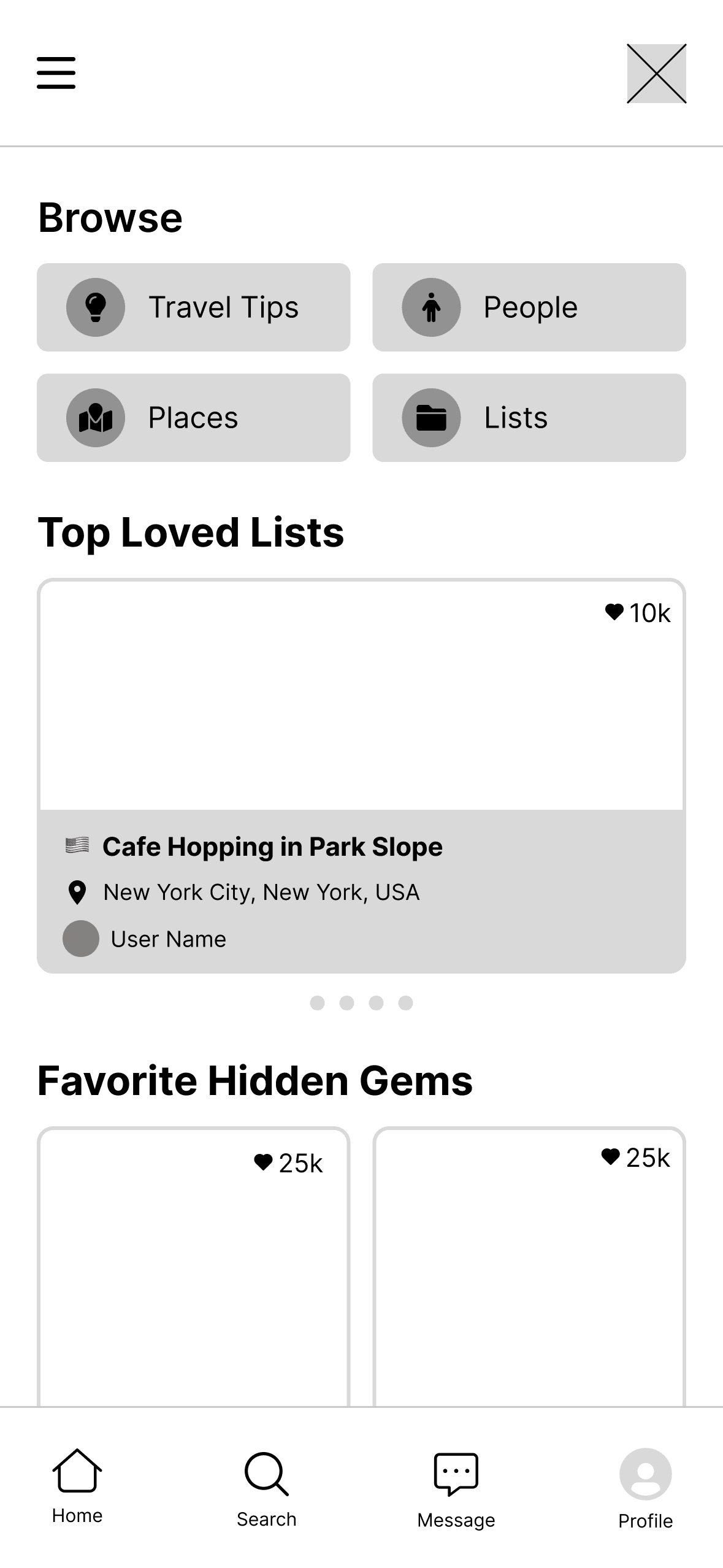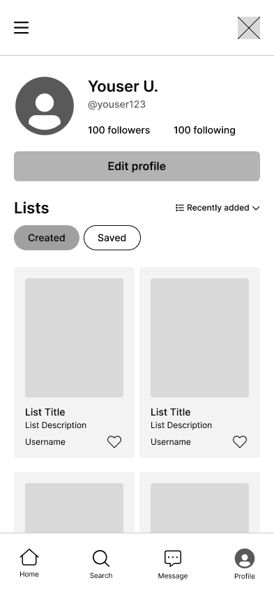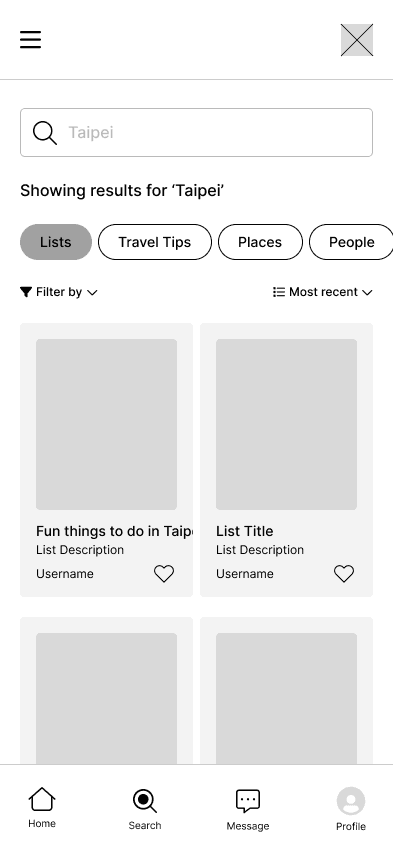 We wireframed Wanderlyโs primary app pages to support core tasks: exploring destinations, searching, managing your profile, and messaging others.
