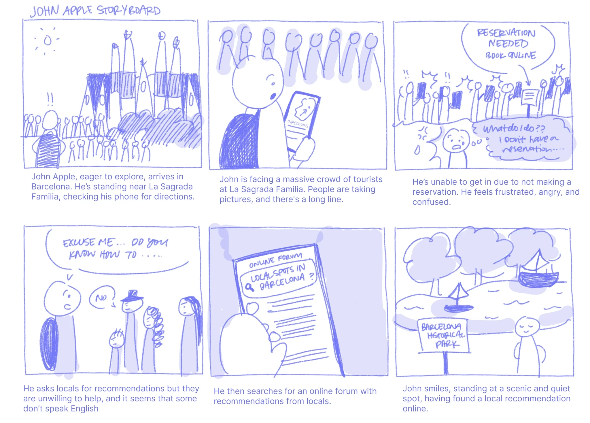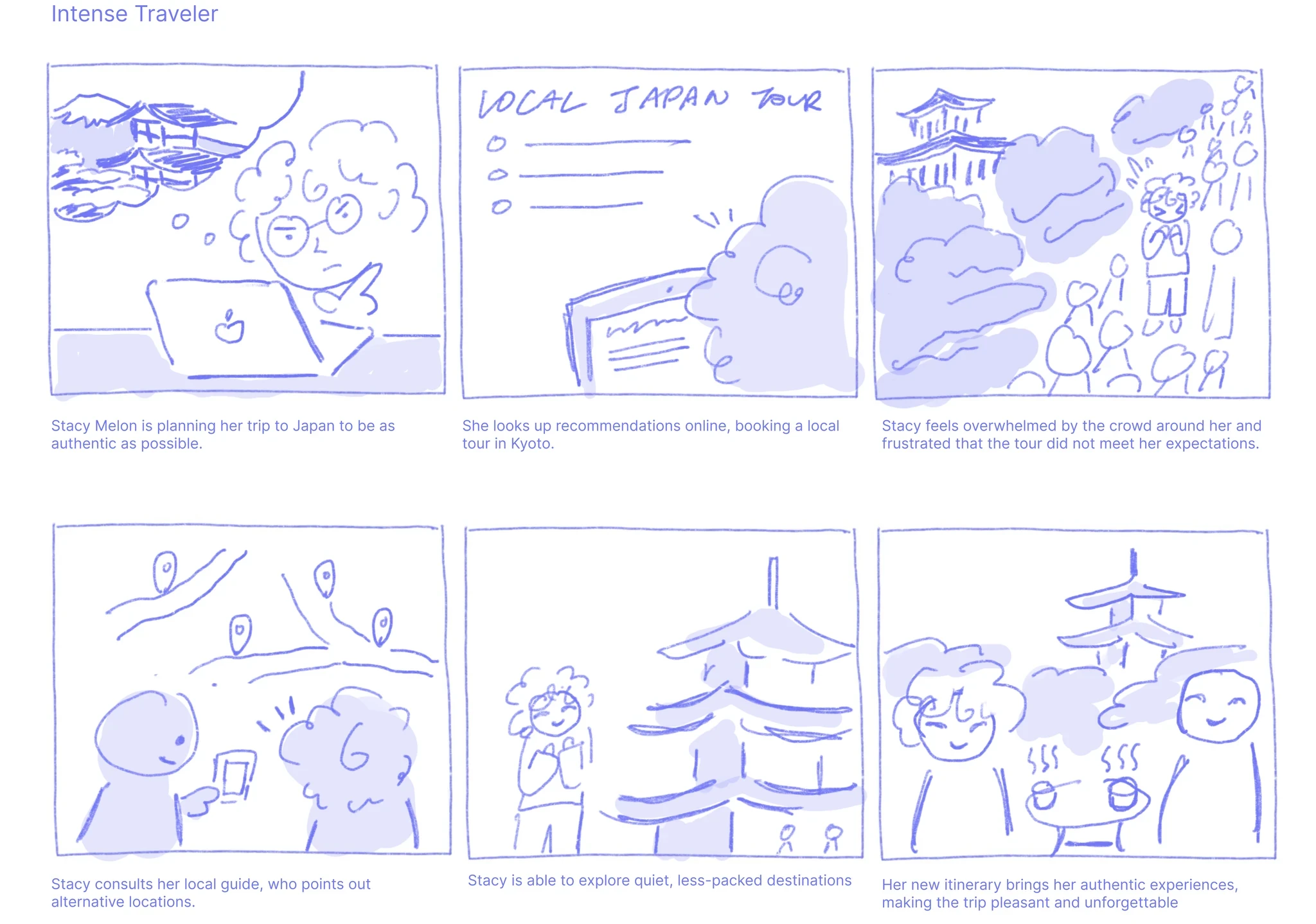 We created four personas to capture different attitudes toward tourism (intense vs. casual) and different personalities (introvert vs. extrovert). We mapped out 2 of our personas to capture where design could meaningfully reduce frustration.